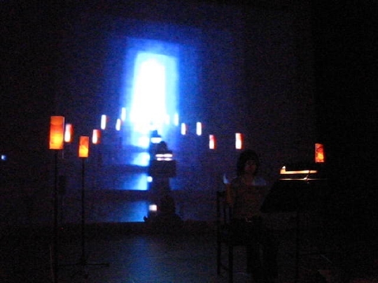 音に反応する照明、カメラとスクリーンのフィードバック回路、インタラクティブ映像の3つを組み合わせた作品。作曲家大村氏の現代曲とのコラボレーション、ドイツカールスルーエのアート&メディアセンターZKMにて。
